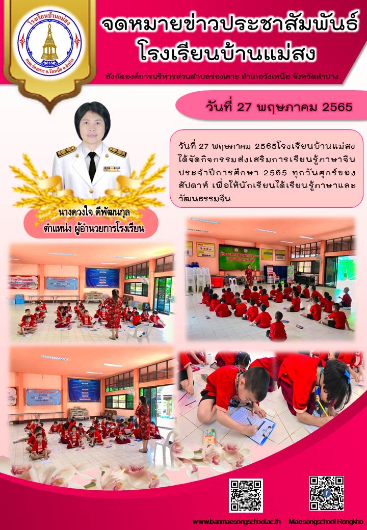 | วันที่ 27 พฤษภาคม 2565โรงเรียนบ้านแม่สง  ได้ จัดกิจกรรมส่งเสริมการเรียนรู้ภาษาจีน ทุกวันศุกร์ ประจำปีการศึกษา 2565 เพื่อให้นักเรียนได้เรียนรู้ภาษาและวัฒนธรรมจีน |